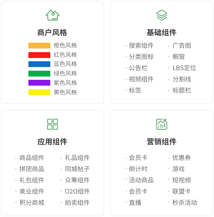 丰富的行业模板,一键应用,积木拖拽组合装修,省时省心