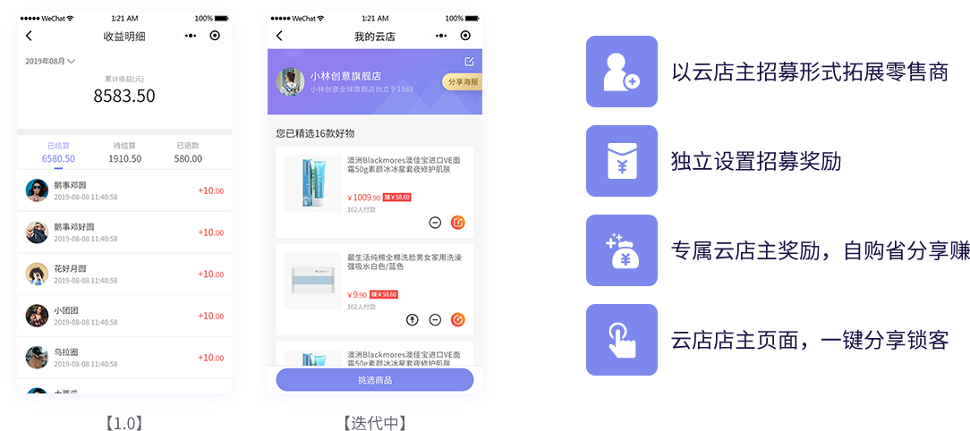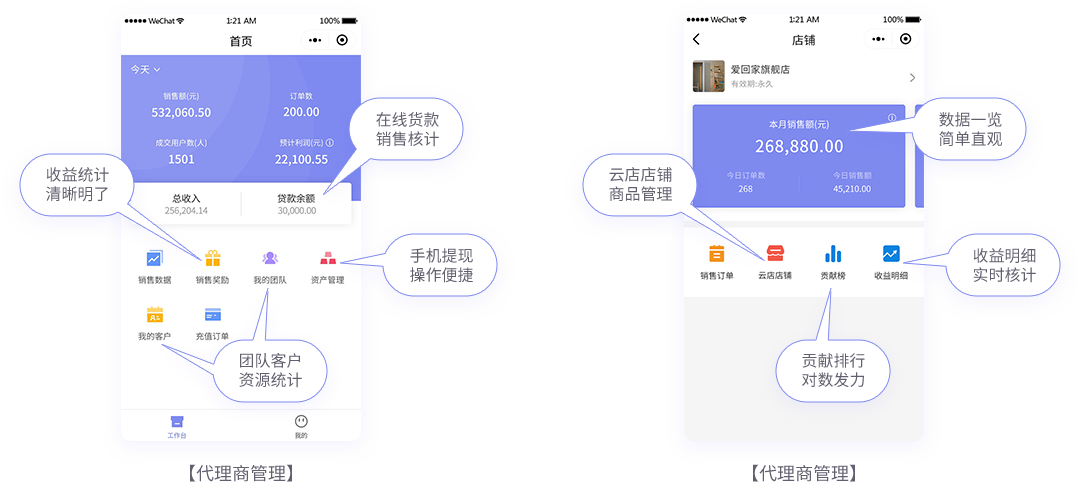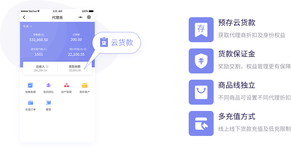 以移动应用云平台为依托,实现移动社交电商平台用户、财务、数据管理,社交营销卖货,团队管理等一体化系统解决方案。