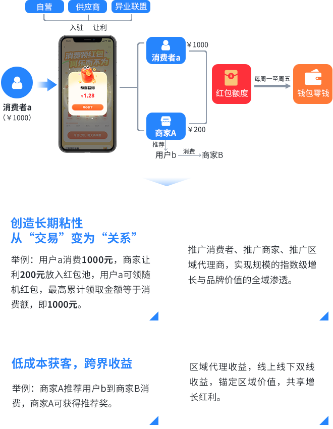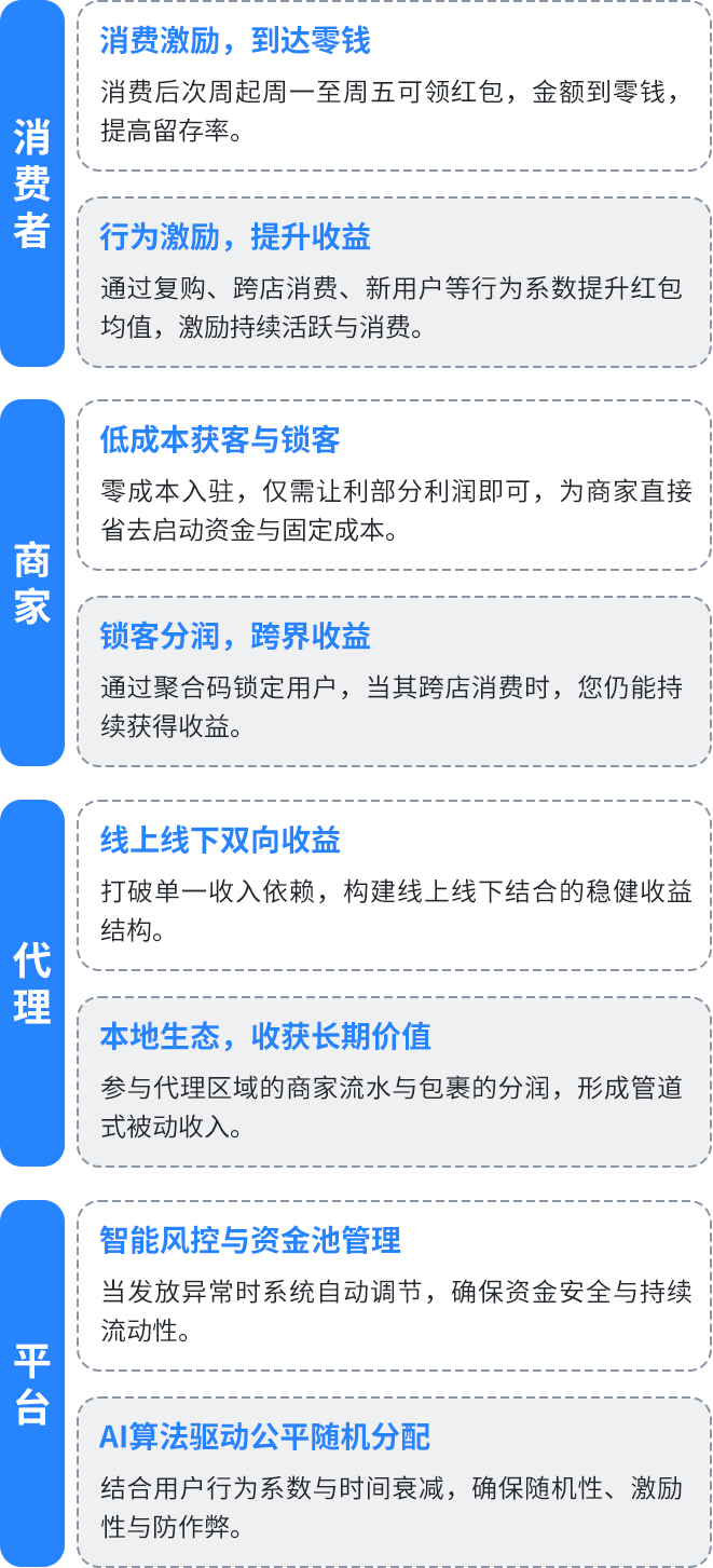 是AI驱动的智能消费激励系统,商家通过让利,将其中的部分让利利润放入“红包池”,消费者在合作商家消费,打卡领取红包到零钱。重构商家与消费者的价值连接方式,将每个商家的独立客流,整合为整个商圈共享的“活水”流量池。