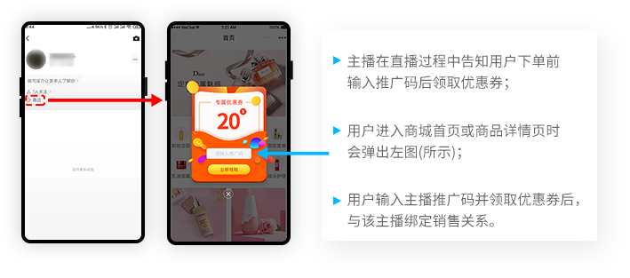 首创【主播推广码】功能,让主播与粉丝可以轻松建立销售关系,并结合【云平台】丰富的奖励机制,实现分销带货。